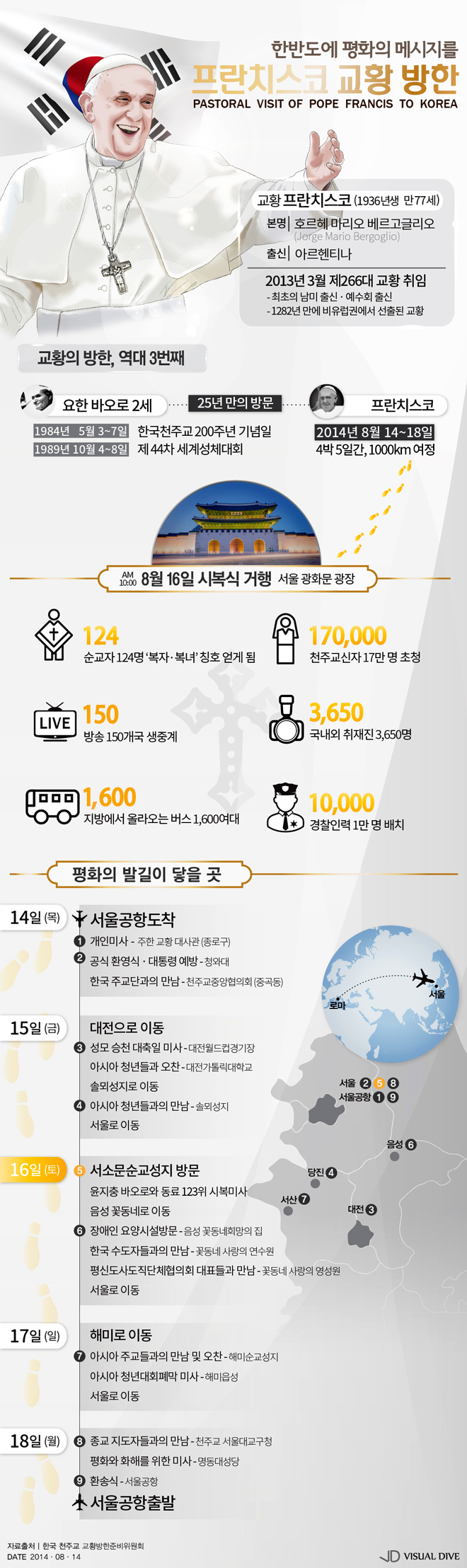 교황은 이날 오후 청와대에서 박 대통령과 면담하고 공직자들을 대상으로 연설한다. 이후 교황은 4박 5일 일정동안 성모승천대축일 미사(8월 15일·대전월드컵경기장), 윤지충 바오로와 동료 순교자 124위의 시복식(諡福式·8월 16일·서울 광화문광장), 제6회 아시아청년대회 폐막미사(8월 17일·충남 해미읍성), 평화와 화해를 위한 미사(8월 18일·서울 명동성당) 등을 직접 집전한다.