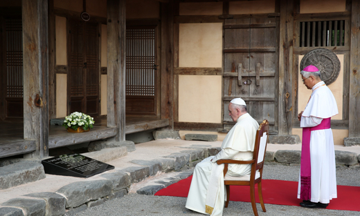 그러면서 “주님은 순교자들의 영웅적인 증언을 통해 당신 영광을 비추셨던 것처럼, 여러분의 삶에서 당신의 영광이 빛나게 하시고, 또 여러분을 통하여 아시아 대륙에 생명의 빛을 밝히기를 원하고 계신다”고 밝혔다.(사진:프란치스코 교황이 15일 충남 당진 솔뫼성지에 있는 김대건 신부의 생가를 방문해 헌화한 뒤 기도하고 있다.)