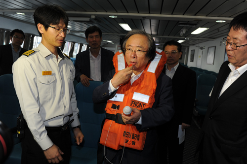 이주영 해양수산부 장관이 3일 추석전 연안여객선 특별수송 전 인천항 연안여객선터미널에 정박 중인 하모니플라워호(인천~백령도)를 방문하여 여객선 안전점검을 했다.