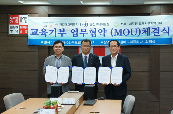 군산대학교 전라·제주권 교육기부지역센터(센터장 유수창 교수)는 3일(수) 카길애그리푸나 군산공장 회의실에서 카길애그리퓨리나 공산공장 및 군산교육지원청과 산・학 협력체계 구축을 위한 교육기부 업무협약(MOU)을 체결했다.