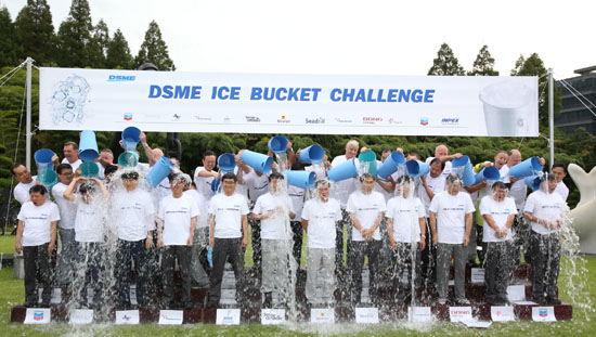대우조선해양(고재호 대표이사)은 지난 18일 17시 30분 신뢰관 앞에서 이 회사의 임원진과 12개 주문주 프로젝트 매니저 및 회사 매니저 36명이 동참한 가운데 ‘DSME 아이스버킷 챌린지’ 행사를 가졌다. (사진:지난 18일 대우조선해양에서 열린 ‘DSME 아이스버킷 챌린지’에 임원진, 주문주 프로젝트 매니저, 회사 프로젝트 매니저가 이벤트에 참여했다. )