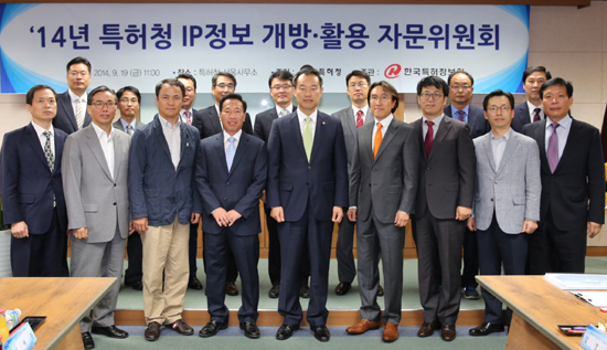 자문위원회는 정부 3.0 정책자문위원 3명(교수 2명, 포럼 대표 1명), 공공데이터전략위원 1명, 특허정보 서비스업체 5명, 공공기관 1명으로 구성되어 있으며, 민간의 특허정보 활용방안, 특허정보 품질 제고방안 등 특허청의 공공데이터 개방정책에 대한 의견을 교환했다.(사진:김영민 특허청장(앞줄 왼쪽 5번째)과 이태근 한국특허정보원장(앞줄 왼쪽 4번째), 최규완 정보고객지원국장(뒷줄 왼쪽 8번째)와 자문위원회 위원들이 기념촬영을 하고 있다.)