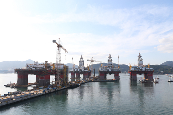 대우조선해양은 지난 24일 거제 옥포조선소에서 고재호 사장과 노르웨이 송가 오프쇼어(Songa Offshore)社 비요날 이버슨 사장(Mr. Bjørnar Iversen)을 비롯한 주요 관계자 200명이 참석한 가운데 반잠수식 시추선 4척에 대한 동시 명명식을 가졌다고 밝혔다. (사진 : 대우조선해양 안벽에서 초대형 반잠수식 시추선 4기의 건조 작업이 한창이다.)