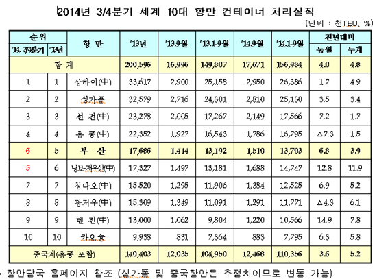 닝보-저우산항은 전년대비 11.9%의 증가율을 기록하며 1억4,747만 TEU를 처리했으며, 부산항은 증가율 3.9%를 기록하며 1,370만TEU를 처리하여 닝보-저우산항에 이어 6위를 기록했다.