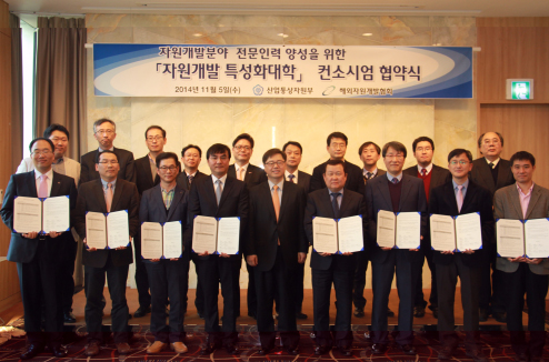 한국해양대학교 에너지자원공학과(학과장 유경근ㆍ사진 앞줄 왼쪽 첫번째)는 2009년부터 시행돼온 1단계 사업에 이어 산업통상자원부가 추진하는 2단계 자원개발 특성화대학사업에 선정되어 지난 5일 한국과학기술회관에서 협약식을 맺었다.