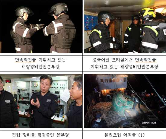 해양경비안전본부는 지난 10월 중순부터 중국 어선들의 조업 성어기를 맞이하여 그 동안 기동전단 운영 및 합동 특별단속 등 총 6회에 걸쳐 집중적인 단속을 실시했다. 단속 결과, 42척의 중국어선이 나포되었으며 11월 들어 21일까지 68척을 검거하는 등 중국어선 단속을 강화하고 있다.