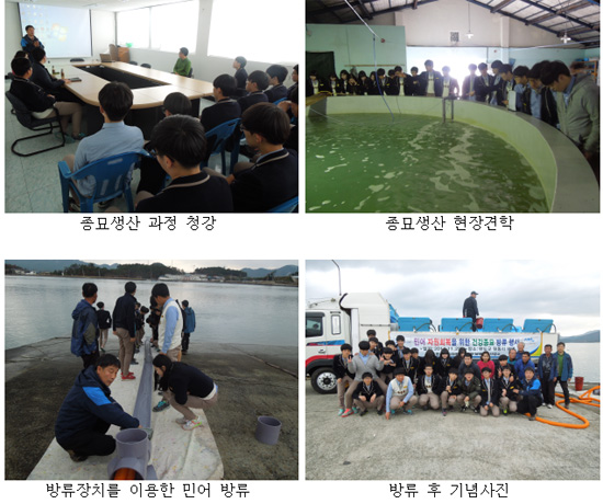 체험행사에 참여한 완도수산고등학교는 올해 전국 유일의 수산계 마이스터고로 개교하여 미래 수산업을 선도할 창의적인 글로벌 수산 전문 인재’를 육성하는 학교이다. 학생들은 FIRA 남해종묘사업소에서 수산자원 조성의 중요성과 민어 종묘생산과정에 대한 기본적인 강의를 청강한 뒤 어린민어 관찰, 민어포획 체험을 거쳐 완도초입에 있는 원동리 해역에서 종묘방류를 실시했다.