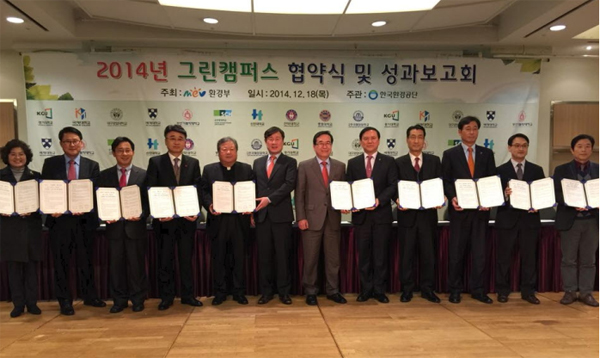 한국해양대학교 박한일 총장(사진 오른쪽 세 번째)은 18일 서울 그랜드힐튼 호텔에서 환경부가 주최하고 한국환경공단이 주관한 ‘2014년 그린캠퍼스 협약식 및 성과보고회’에 참가하여 그린캠퍼스 협약을 체결했다.