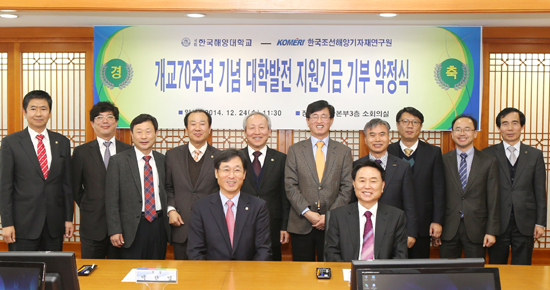 코메리 김기정 원장은 “우리 연구원이 한국해양대 부설 연구센터에서 출발해 지난 10여 년 간 발전을 거듭하는 데 한국해양대의 협조와 지원이 컸다”며 “한국해양대가 개교 70주년을 맞이해 더 큰 도약의 발판을 마련하는데 보탬이 되기를 바란다”며 발전기금 3억 원을 약정했다.