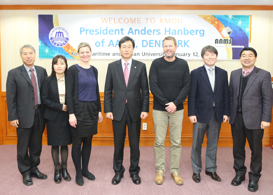 덴마크 오르후스해양과학기술대학(AAMS) Anders Hanberg 총장(사진 오른쪽 세 번째) 일행이 12일 오전 한국해양대학교(총장 박한일ㆍ사진 정중앙)를 방문했다.