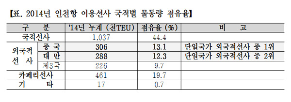 인천항을 이용하는 외국적선사의 컨테이너 물동량 실적 중 중국 선사와 대만 선사의 점유율이 가장 높은 비중을 보이고 있다는 점을 감안한 집중 마케팅 행보라고 인천항만공사(IPA)는 설명했다.