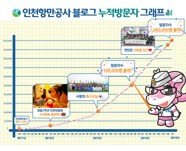 인천항만공사(www.icpa.or.kr, 사장 유창근)는 지난 2011년 11월 블로그 오픈 이후 39개월 만에, 22일 오전 인천항 블로그 누적 방문자가 100만명을 넘어섰다고 밝혔다. 인천항 블로그는 현재 하루 평균 2,000명~2,500명이 방문하면서 인천항의 대 국민 소통 창구 역할을 톡톡히 수행하고 있다.