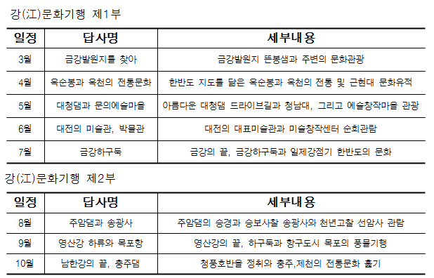 또한, 강(江)문화기행은 금강권을 중심으로 수변 역사문화벨트에 대한 문화답사 프로그램으로 1부(3~7월)와 2부(8~10월)로 나뉘어 진행되며 금강권역을 중심으로 한 역사와 근현대 문화유적 답사, 미술관 답사 및 금강하구둑 주변의 일제강점기 한반도 문화답사 등이 예정되어 있다.