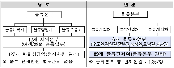 코레일 물류사업부는 지역본부에서 분리된 6개 물류사업단과 산하 89개 물류역으로 재편되며 총 1,367명의 인력으로 구성된다.