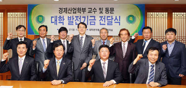 한국해양대학교(총장 박한일)는 27일 오후 대학본부 3층 소회의실에서 ‘경제산업학부 대학발전기금 전달식’을 가졌다. 이날 전달된 발전기금은 5천만 원으로 경제산업학부(학부장 나호수)의 학부생 및 대학원생, 동문, 교수들이 정성껏 모금한 성금이다.