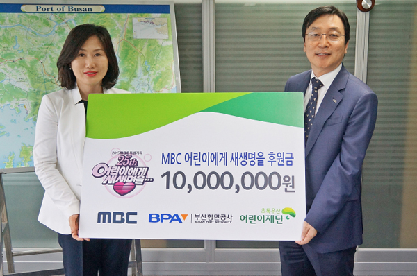 부산항만공사(BPA, 임기택 사장)는 4월 30일 MBC와 초록우산어린이재단이 함께 하는 2015년 '어린이에게 새 생명을' 프로그램에 참여, 소아암과 백혈병 등으로 고통받는 아이들에게 의료비를 지원할 수 있도록 1천만원을 후원했다.