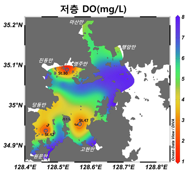 진해만 해역 내측 명주만, 당동만 입구 남측해역, 가조도 동측해역저층 약 1m에서 1.39~2.72 ㎎/L 범위의 용존산소 농도가 관측됐다.