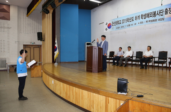 군산대학교(총장 나의균)는 13일 오후 군산대학교 제 1학생회관 대강당에서 “ 2015학년도 제5기 학생해외봉사단 출정식”을 개최하고 이달 20일부터 12박 14일 일정으로 해외봉사활동에 나서기로 했다. 출정식은 나의균 총장을 비롯하여 본부 주요 보직자 및 직원, 학생봉사단원 등이 참석한 가운데 개최됐다.