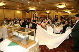 6000unit급 자동차운반선을 발주한 노르웨이 호그 오토라이너사는 지난 10일 가진 선박 인도 감사파티 자리에서 직원복지기금 1만달러와 200분의1로 축소한 자사 인도선박 모형을 선물로 전달했다.