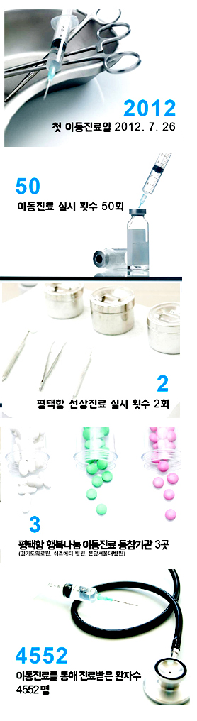 행복나눔 이동진료는 매월 정기적으로 실시하고 있으며 지금까지 50차례에 걸쳐 총 4,552명이 진료혜택을 받았다. 이들 중 대부분은 평택항 국제카페리를 이용하는 소무역상인으로 중국을 오가며 생계를 유지하는 고령자이다.
