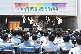 현대중공업은 6월 12일 협력회사인 신한기계(주)(울산 울주군 온산읍 우봉리 117번지)를 방문, 협력회사 임직원 300여명을 대상으로 동아브라스콰이어의 금관5중주와 울산대학교 음악대학 박상혁 교수의 테너 독창, 인기가요, 장고춤, 월드컵 국민 응원댄스 등이 어우러진 ‘찾아가는 음악회’를 개최했다.