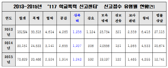 117 학교폭력 신고센터의 성폭력 신고접수 현황은 ▲2013년 1,256건 ▲2014년 1,207건 ▲2015년 1,243건으로 줄지 않고 있으며, 2015년에는 오히려 전년대비 늘어났다.