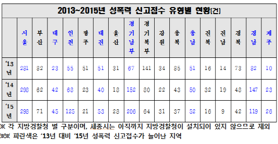 부산·광주·울산·경기북부·강원·충북·전북·전남·경북 지역은 2013년 대비 2015년 성폭력 신고접수 현황이 줄어들은 데 비해, 서울·대구·인천·대전·경기남부·충남·경남·제주의 경우는 2013년 대비 2015년 성폭력 신고접수가 늘어났다.