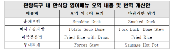 관광특구 내 한식당에서 잘못된 외래어 표기 다수 발견....