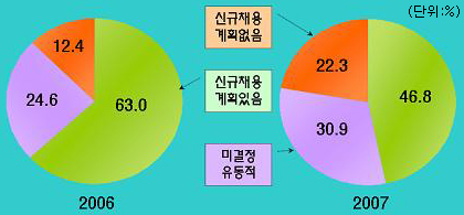 신규인력 채용계획을 묻는 설문(표 참고)올해 신규인력 채용계획이 있거나 이미 채용했다’라고 응답한 기업은 전체의 46.8%, ‘현재까지 인력채용 계획이 없다’라고 응답한 기업은 22.3%, ‘채용여부가 아직 결정되지 않았거나 유동적’인 기업은 30.9%로 조사되었다. 이를 2006년 조사와 비교해 보면, ‘계획 있음’은 16.2%p 감소한 반면, ‘계획 없음’과 ‘미결정’은 각각 9.9%p, 6.3%p 증가했다. ‘계획있음’이라고 응답한 기업의 경우 산업별로는 제조업(44.9%)과 비제조업(45.2%)은 비슷한 수치를 나타냈으며, 규모별로는 대기업(51.2%)이 중소기업(41.9%)보다 9.3%p 높은 것으로 조사됐다.