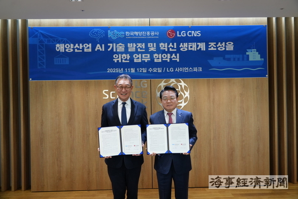 한국해양진흥공사(해진공, 사장 안병길)가 LG CNS(사장 현신균)와 함께 해양산업의 디지털 전환 가속화를 위해 손을 잡았다. 양 기관은 11월 12일(수) 해양산업 AI 생태계 조성과 데이터 경제 활성화를 위한 업무협약(MOU)을 체결했다.