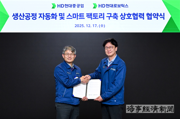 양사는 12월 17일 울산 HD현대중공업 본관에서 ‘생산 공정 자동화 및 스마트 팩토리 구축’을 위한 업무협약을 체결했다고 밝혔다. 조선업 전반의 수작업 중심 공정을 혁신하고, HD현대의 FOS 프로젝트와 연계해 자율 운영형 스마트 조선소 구축을 추진한다는 취지다.