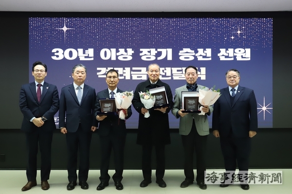 재단법인 선원기금재단(이사장 이승우)은 12월 24일 서울 여의도 해운빌딩에서 ‘장기 승선 선원 격려금 전달식’을 열고, 장기간 선상 근무로 해운산업 발전에 기여한 선원들에게 공로패와 격려금을 전달했다고 밝혔다.