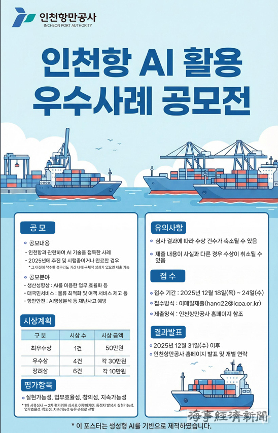 인천항만공사(사장 이경규)는 ‘2025년 인천항 혁신을 위한 AI 활용 우수사례 공모전’을 개최하고 인천항 관련 업무에서 인공지능을 활용한 혁신 사례 발굴에 나선다고 12월 25일 밝혔다.