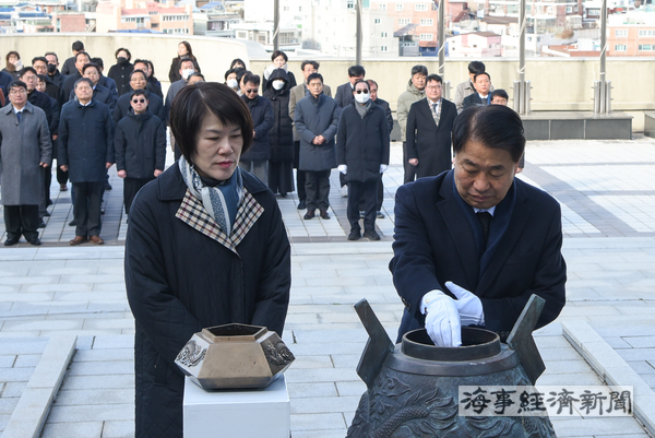 전국해상선원노동조합연맹(위원장 박성용, 이하 선원노련)은 2026년 새해를 맞아 1월 5일 오전 11시 부산 영도구 순직선원위령탑을 찾아 참배하고 바다에서 생을 마감한 순직선원들의 넋을 기렸다.