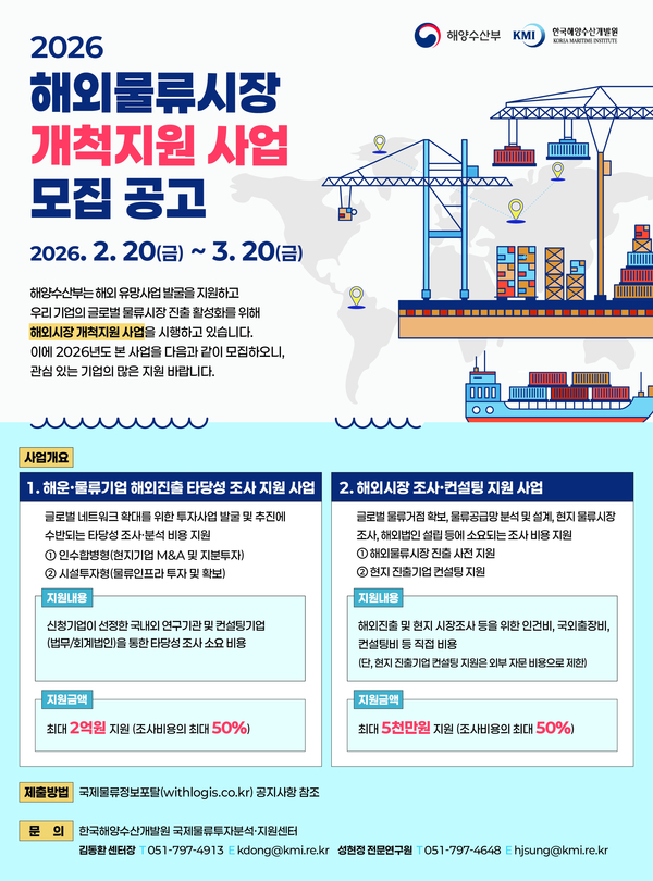 해양수산부는 해외에 진출하는 물류기업을 지원하기 위한 「2026 해외물류시장 개척지원 사업」 공모를 2월 20일부터 3월 20일까지 진행한다고 밝혔다.