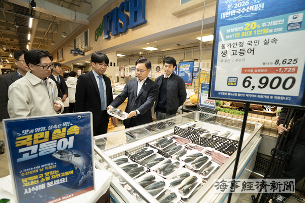 김성범 해양수산부 차관이 부산 지역 대형마트를 찾아 수산물 할인행사 운영 상황을 점검하고, 소형 고등어를 활용한 ‘국민 실속 고등어’ 판매 현장을 살폈다.