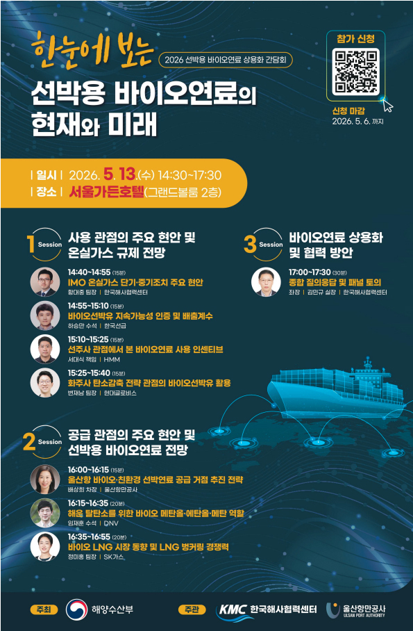 행사는 7개 기관 전문가 발표와 패널토의로 진행되며, 선박용 바이오연료에 관심 있는 사람은 누구나 참석할 수 있다. 참가 신청은 5월 6일까지 온라인으로 받는다.