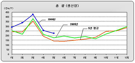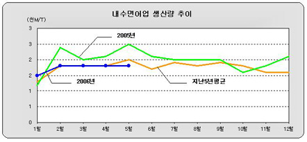o 2006년 5월중 어업생산량은 22만3025M/T으로 2005년 동월(175,254M/T)대비 27.3% 증가(5년평균 대비 59.4% 증가)
