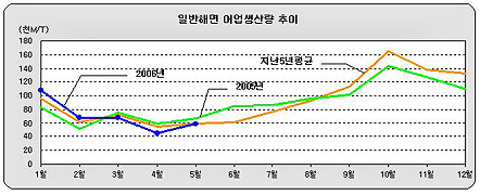 일반해면어업은 2005년 5월보다 생산량이 12.1% 감소했으나, 병어(2764톤), 전갱이 (2235톤), 청어(2103톤), 꽃게(1248톤)는 각각 46.0%, 65.2%, 55.4%, 220.8% 증가했다.