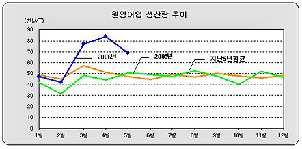 o 원 양 : 5월중 69만163M/T 생산, 2005년 동월(50만641M/T) 대비 36.6% 증가