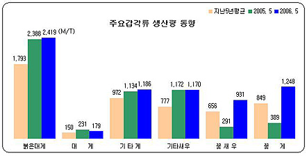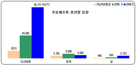 o 천해양식 : 5월중 93만025M/T 생산, 2005년 동월(54만957M/T) 대비 69.3% 증가