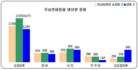 ▶ 어류 : 5월중 38만459M/T 생산, 2005년 동월(45만957M/T) 대비 16.3% 감소