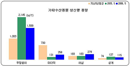 ▶ 5월중 기타수산동물 2303M/T 생산, 2005년 동월(2709M/T) 대비 15.0% 감소