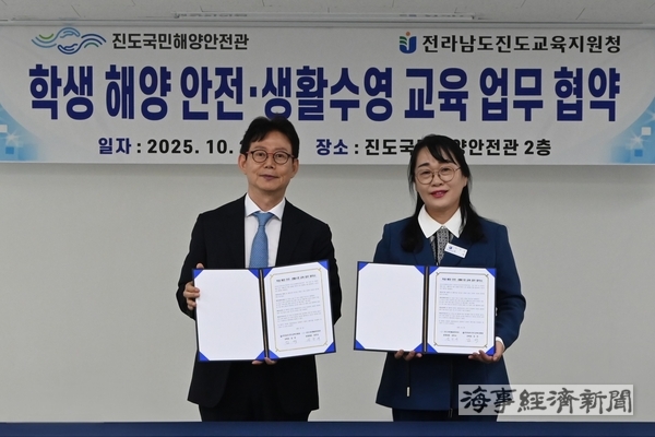 진도국민해양안전관과 전라남도진도교육지원청이 10월 29일 전남 진도군 임회면 진도국민해양안전관에서 학생 해양안전과 생활수영 교육 강화를 위한 업무협약을 맺었다.