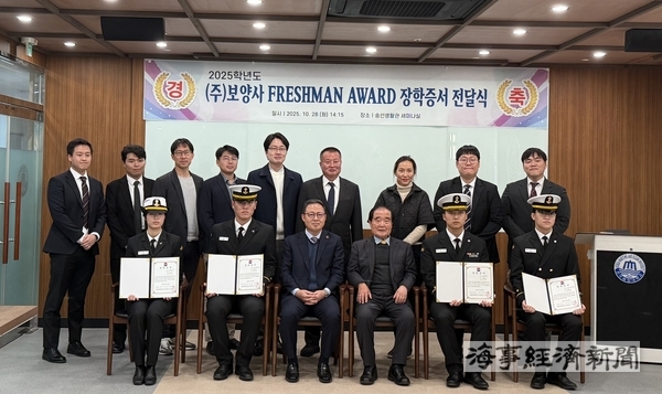 국립한국해양대학교 해사대학이 10월 28일 승선생활관 세미나실에서 ㈜보양사 프레시맨 어워드 장학증서 전달식을 열고 총 1천만 원의 장학금을 수여했다.
