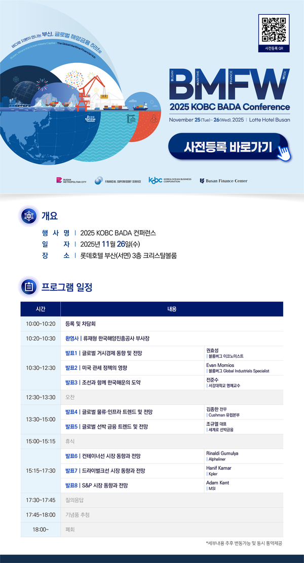 Bloomberg는 미국의 통상정책과 글로벌 거시경제 변화가 해운과 무역시장에 미치는 영향을 분석하며, Cushman & Wakefield는 물류·인프라 투자 동향을, 세계로선박금융은 선박금융 시장의 최신 트렌드를 소개할 예정이다.