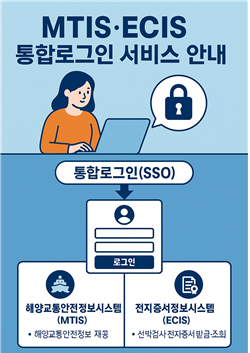 한국해양교통안전공단(KOMSA, 이사장 김준석)은 해양교통안전정보시스템(MTIS)과 전자증서정보시스템(ECIS)을 하나의 인증으로 이용할 수 있는 통합 로그인(Single Sign-On, SSO) 서비스를 11월 25일(화)부터 정식 운영한다고 밝혔다.