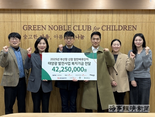 부산항만공사는 3일 초록우산 어린이재단 부산지역본부에서 2025년 부산항 신항 항만배후단지 태양광 발전사업 복지기금 전달식을 열고 발전사업자 6곳과 함께 총 4천2백25만원의 기금을 전달했다고 밝혔다.