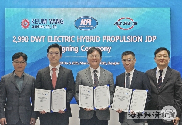 한국선급은 지난 3일 중국 상하이에서 열린 조선 해양 전시회 마린텍 차이나 2025 현장에서 금양상선, ALSEN Maritime과 2천990DWT급 일반 화물선용 전기 하이브리드 추진 시스템 개념 설계 공동 개발을 위한 3자 업무협약을 체결했다고 밝혔다.