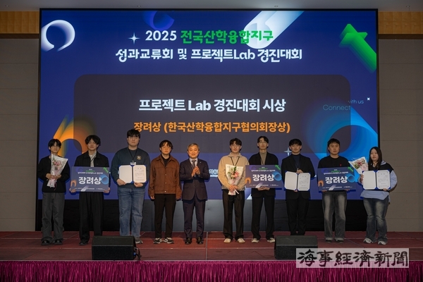 국립한국해양대 해양신소재융합공학과 4학년 윤주원·이정환·이윤원·김민규 학생으로 구성된 ‘소재연금술사’ 팀(지도교수 심도식)은 지난 11월 27일 청주 엔포드호텔에서 열린 ‘2025년 전국산학융합지구 성과교류회 및 프로젝트Lab 경진대회’에서 장려상(한국산학융합지구협의회 회장상)을 수상했다.
